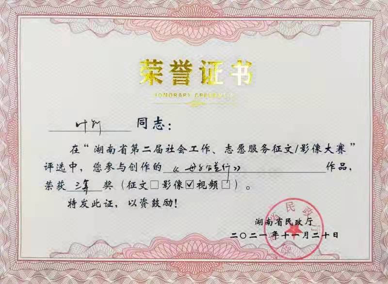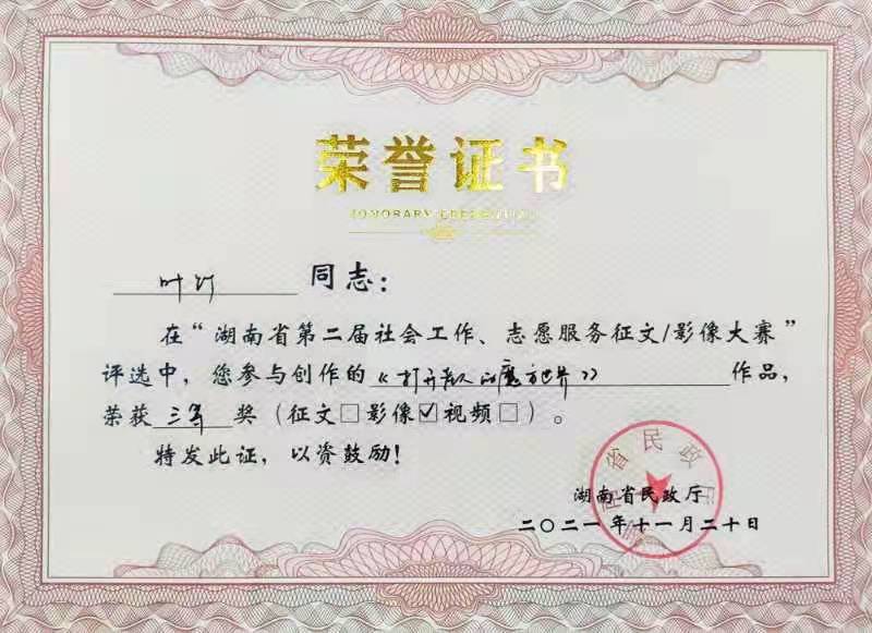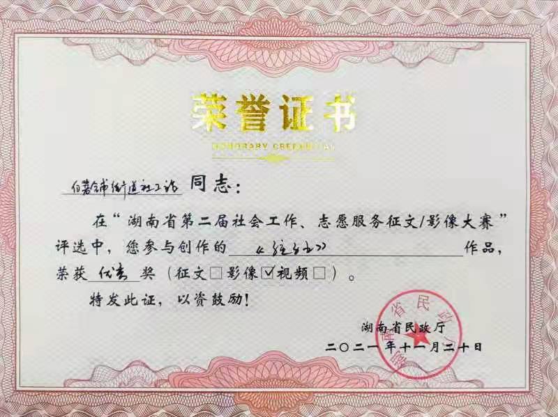 2021年,我司多名员工积极踊跃投稿参与由湖南省民政厅主办、湖南公共频道承办的湖南省第二届社会工作、志愿服务征文暨影像大赛。他们讲述平凡而伟大的故事,展现社会工作者精神风貌,传播真善美,弘扬正能量。其中两篇原创征文作品、三幅原创影像作品在比赛中脱颖而出,荣获一等奖1个、三等奖3个、优秀奖1个。